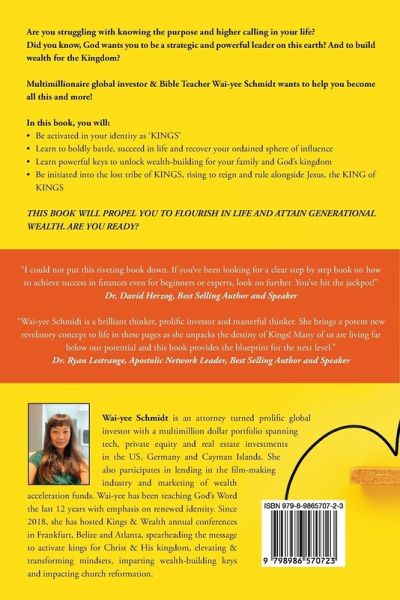 Are you struggling with knowing the purpose and higher calling in your life? Did you know, God wants you to be a strategic and powerful leader on this earth? And to build wealth for the Kingdom? Multimillionaire global investor and Bible Teacher Wai-yee Schmidt wants to help you become all this and more! In this book, you will:Be activated in your identity as 'KINGS' Learn to boldly battle, succeed in life and recover your ordained sphere of influence Learn powerful keys to unlock wealth-building for your family and God's kingdom Be initiated into the lost tribe of KINGS, rising to reign and rule alongside Jesus, the King of KINGS THIS BOOK WILL PROPEL YOU TO FLOURISH IN LIFE AND ATTAIN GENERATIONAL WEALTH. ARE YOU READY?