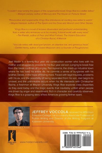 Joel Martin is a twenty-four year old construction worker who lives with his mother and struggles to provide for his four year old son. Longing to break free from the bleak confines of Langley, Pennsylvania, the dried-up industrial town where he has lived his entire life, he commits a series of burglaries with his brother, Derek, in the hope of finding more. Faced with legal troubles, problems with his ex, and the possibility of being separated from his son, Joel begins to unravel, and the unthinkable occurs when his life intersects with Christopher Roche, a freshman at Waylan University. Kings Row explores class disparities as they exist today and the tragic events that inevitably unfold when people are driven by anger and resentment. Rich in character and carefully observed, Kings Row is a gripping story of two Americas growing farther apart. PRAISE FOR KINGS ROW: "In the utterly absorbing Kings Row, Jeffrey Voccola shows himself to be a master of the faultlines of class and of all the ways, large and small, in which people hurt each other. I couldn't stop turning the pages of this suspenseful novel. Kings Row is a stellar debut." --Margot Livesey, author of Mercury and The House on Fortune Street "This beautifully-paced, eloquent and suspenseful novel is full of persuasive, sharply observed psychology, sociology, and topology, and an honest voicing of working class people, male and female....Voccola writes with dead-pan lyricism, an attentive ear, and generous heart." --DeWitt Henry, author of Sweet Marjoram and co-founder of Ploughshares "From its masterful opening chapter on, Kings Row captures the divides and resentments that have brought us to this moment in America. This novel is a deep study of people unsure of their positions in their personal lives and in the larger sphere of change. Voccola writes beautifully and compassionately, even about tragedy." --Tim Parrish, author of Fear and What Follows: The Violent Education of a Christian Racist, A Memoir "Kings Row masterfully deconstructs a killing deeply emblematic of the class and race issues that plague our time. With lyrical, heart-piercing realism, Jeffrey Voccola evokes our deepest compassion for these ill-fated characters, showing us ourselves reflected in college students struggling to belong, in displaced working class communities. Provocative and suspenseful, Kings Row introduces an exciting new writer to watch." --Wayne Harrison, author of The Spark and the Drive and Wrench and Other Stories