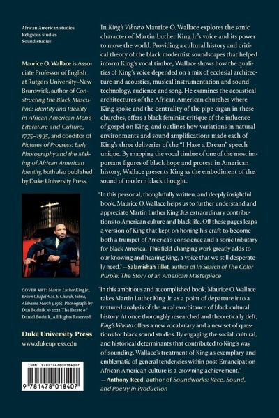 In King's Vibrato Maurice O. Wallace explores the sonic character of Martin Luther King Jr.'s voice and its power to move the world. Providing a cultural history and critical theory of the black modernist soundscapes that helped inform King's vocal timbre, Wallace shows how the qualities of King's voice depended on a mix of ecclesial architecture and acoustics, musical instrumentation and sound technology, audience and song. He examines the acoustical architectures of the African American churches where King spoke and the centrality of the pipe organ in these churches, offers a black feminist critique of the influence of gospel on King, and outlines how variations in natural environments and sound amplifications made each of King's three deliveries of the "I Have a Dream" speech unique. By mapping the vocal timbre of one of the most important figures of black hope and protest in American history, Wallace presents King as the embodiment of the sound of modern black thought.