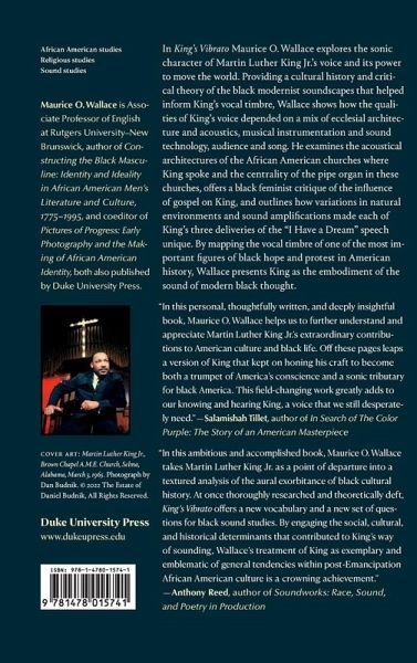 In King's Vibrato Maurice O. Wallace explores the sonic character of Martin Luther King Jr.'s voice and its power to move the world. Providing a cultural history and critical theory of the black modernist soundscapes that helped inform King's vocal timbre, Wallace shows how the qualities of King's voice depended on a mix of ecclesial architecture and acoustics, musical instrumentation and sound technology, audience and song. He examines the acoustical architectures of the African American churches where King spoke and the centrality of the pipe organ in these churches, offers a black feminist critique of the influence of gospel on King, and outlines how variations in natural environments and sound amplifications made each of King's three deliveries of the "I Have a Dream" speech unique. By mapping the vocal timbre of one of the most important figures of black hope and protest in American history, Wallace presents King as the embodiment of the sound of modern black thought.