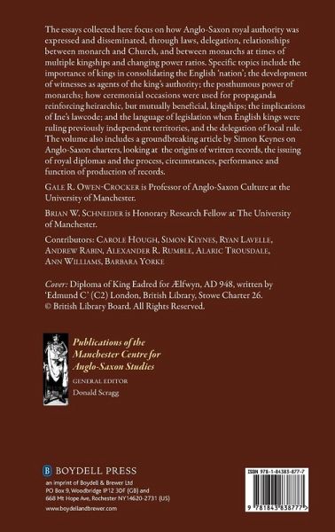 The essays collected here focus on how Anglo-Saxon royal authority was expressed and disseminated, through laws, delegation, relationships between monarch and Church, and between monarchs at times of multiple kingships and changing power ratios. Specific topics include the importance of kings in consolidating the English "nation"; the development of witnesses as agents of the king's authority; the posthumous power of monarchs; how ceremonial occasions were used for propaganda reinforcing heirarchic, but mutually beneficial, kingships; the implications of Ine's lawcode; and the language of legislation when English kings were ruling previously independent territories, and the delegation of local rule. The volume also includes a groundbreaking article by Simon Keynes on Anglo-Saxon charters, looking at the origins of written records, the issuing of royal diplomas and the process, circumstances, performance and function of production of records. Gale R. Owen-Crocker is Professor of Anglo-Saxon Culture at the University of Manchester. Contributors: Ann Williams, Alexander R. Rumble, Carole Hough, Andrew Rabin, Barbara Yorke, Ryan Lavelle, Alaric Trousdale