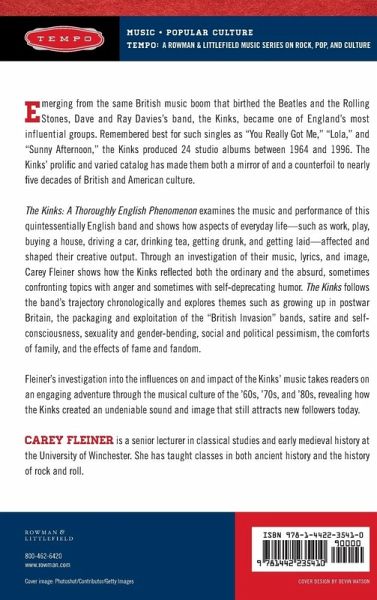 Emerging from the same British music boom that birthed the Beatles and the Rolling Stones, Dave and Ray Davies's band, the Kinks, became one of England's most influential groups. Remembered best for such singles as "You Really Got Me," "Lola," and "Sunny Afternoon," the Kinks produced 24 studio albums between 1964 and 1996. The Kinks' prolific and varied catalog have made them both a mirror of and a counterfoil to nearly five decades of British and American culture. The Kinks: A Thoroughly English Phenomenon examines the music and performance of this quintessentially English band and shows how aspects of everyday life such as work, play, buying a house, driving a car, drinking tea, getting drunk, and getting laid, affected and shaped their creative output. Through an investigation of their music, lyrics, and image, Carey Fleiner shows how the Kinks reflected both the ordinary and the absurd, sometimes confronting topics with anger and sometimes with self-deprecating humor. The Kinks follows the band's trajectory more or less chronologically and explores themes such as growing up in post-war Britain, the packaging and exploitation of the "British Invasion" bands, satire and self-consciousness, sexuality and gender-bending, social and political pessimism, the comforts of family, and the effects of fame and fandom. Fleiner's investigation into the influences on and impact of the Kinks' music takes readers on an engaging adventure through the musical culture of the '60s, '70s, and '80s, revealing how the Kinks created an undeniable sound and image that still attracts new followers today.