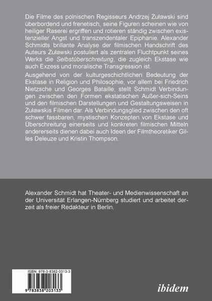 Die Filme des polnischen Regisseurs Andrzej ulawski sind überbordend und frenetisch, seine Figuren scheinen wie von heiliger Raserei ergriffen und rotieren ständig zwischen existenzieller Angst und transzendentaler Epiphanie. Alexander Schmidts brillante Analyse der filmischen Handschrift des Auteurs ulawski postuliert als zentralen Fluchtpunkt seines Werks die Selbstüberschreitung, die zugleich Ekstase wie auch Exzess und moralische Transgression ist.