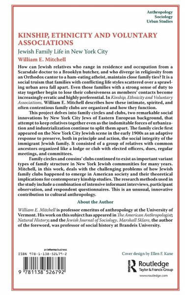 How can Jewish relatives who range in residence and occupation from a Scarsdale doctor to a Brooklyn butcher, and who diverge in religiosity from an Orthodox cantor to a ham-eating atheist, maintain close family ties? It is a social truism that families with conflicting life styles scattered over a sprawling urban area fall apart. Even those families with a strong sense of duty to stay together begin to lose their cohesiveness as members' contacts become increasingly erratic and highly preferential. In "Kinship, Ethnicity and Voluntary Associations", William E. Mitchell describes how these intimate, spirited, and often contentious family clubs are organized and how they function.This project delves into family circles and clubs, two remarkable social innovations by New York City Jews of Eastern European background, that attempt to keep relatives together even as the indomitable forces of urbanization and industrialization continue to split them apart. The family circle first appeared on the New York City Jewish scene in the early 1900s as an adaptive response to preserve, both in principle and action, the social integrity of the immigrant Jewish family. It consisted of a group of relatives with common ancestors organized like a lodge or club with elected officers, dues, regular meetings, and committees.Family circles and cousins' clubs continued to exist as important variant types of family structure in New York Jewish communities for many years. Mitchell, in this work, deals with the challenging problems of how Jewish family clubs happened to emerge in American society and their theoretical implications for contemporary kinship studies. The research methods used in the study include a combination of intensive informant interviews, participant observation, and respondent questionnaires. This is an unusual, innovative contribution to cultural anthropology.