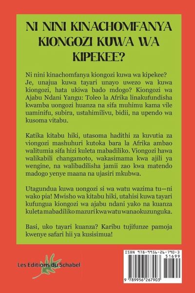 Ni nini kinachomfanya kiongozi kuwa wa kipekee? Je, unajua kuwa tayari unayo uwezo wa kuwa kiongozi, hata ukiwa bado mdogo? Kiongozi wa Ajabu Ndani Yangu: Toleo la Afrika linakufundisha kwamba uongozi huanza na sifa muhimu kama vile uaminifu, subira, ustahimilivu, bidii, na upendo wa kusoma vitabu. Katika kitabu hiki, utasoma hadithi za kuvutia za viongozi mashuhuri kutoka bara la Afrika ambao walitumia sifa hizi kuleta mabadiliko. Viongozi hawa walikabili changamoto, wakasimama kwa ajili ya wengine, na walibadilisha jamii zao kwa matendo madogo yenye maana na ujasiri mkubwa. Utagundua kuwa uongozi si wa watu wazima tu-ni wako pia! Mwisho wa kitabu hiki, utahisi kuwa tayari kufungua kiongozi wa ajabu ndani yako na kuanza kuleta mabadiliko mazuri kwa watu wanaokuzunguka. Basi, uko tayari kuanza? Karibu tujifunze pamoja kwenye safari hii ya kusisimua!
