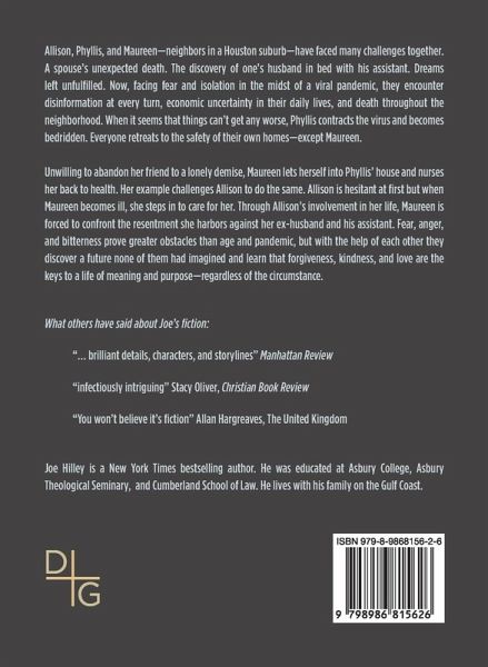 Allison, Phyllis, and Maureen-neighbors in a Houston suburb-have faced many challenges together. A spouse's unexpected death. The discovery of one's husband in bed with his assistant. Dreams left unfulfilled. Now, facing fear and isolation in the midst of a viral pandemic, they encounter disinformation at every turn, economic uncertainty in their daily lives, and death throughout the neighborhood. When it seems that things can't get any worse, Phyllis contracts the virus and becomes bedridden. Everyone retreats to the safety of their own homes-except Maureen. Unwilling to abandon her friend to a lonely demise, Maureen lets herself into Phyllis' house and nurses her back to health. Her example challenges Allison to do the same. Allison is hesitant at first but when Maureen becomes ill, she steps in to care for her. Through Allison's involvement in her life, Maureen is forced to confront the resentment she harbors against her ex-husband and his assistant. Fear, anger, and bitterness prove greater obstacles than age and pandemic, but with the help of each other they discover a future none of them had imagined and learn that forgiveness, kindness, and love are the keys to a life of meaning and purpose-regardless of the circumstance.