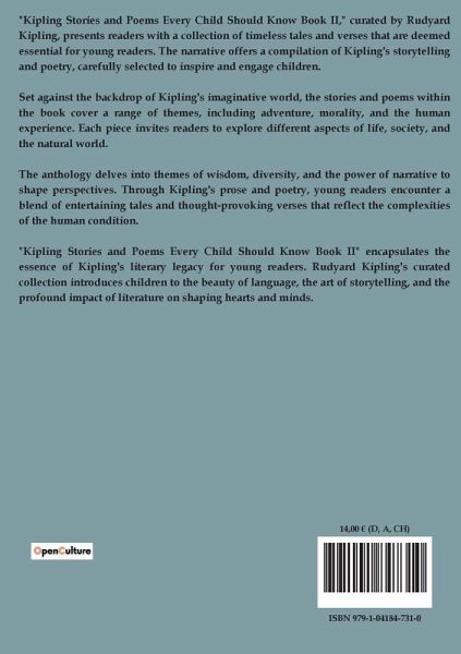 "Kipling Stories and Poems Every Child Should Know Book II," curated by Rudyard Kipling, presents readers with a collection of timeless tales and verses that are deemed essential for young readers. The narrative offers a compilation of Kipling's storytelling and poetry, carefully selected to inspire and engage children. Set against the backdrop of Kipling's imaginative world, the stories and poems within the book cover a range of themes, including adventure, morality, and the human experience. Each piece invites readers to explore different aspects of life, society, and the natural world. The anthology delves into themes of wisdom, diversity, and the power of narrative to shape perspectives. Through Kipling's prose and poetry, young readers encounter a blend of entertaining tales and thought-provoking verses that reflect the complexities of the human condition. "Kipling Stories and Poems Every Child Should Know Book II" encapsulates the essence of Kipling's literary legacy for young readers. Rudyard Kipling's curated collection introduces children to the beauty of language, the art of storytelling, and the profound impact of literature on shaping hearts and minds.