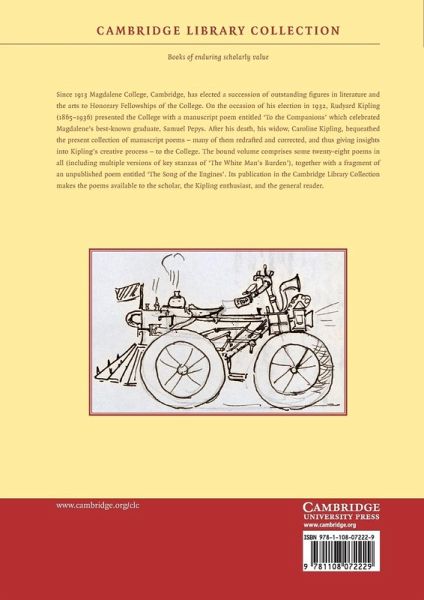 Since 1913 Magdalene College, Cambridge, has elected a succession of outstanding figures in literature and the arts to honorary fellowships of the college. On the occasion of his election in 1932, Rudyard Kipling (1865-1936) presented the college with a manuscript poem entitled 'To the Companion' which celebrated Magdalene's best-known graduate, Samuel Pepys. After his death, his widow, Caroline Kipling, bequeathed the present collection of manuscript poems - many of them redrafted and corrected, and thus giving insights into Kipling's creative process - to the college. The bound volume comprises some twenty-eight poems in all (including multiple versions of key stanzas of 'The White Man's Burden'), together with a fragment of an unpublished poem entitled 'The Song of the Engine'. Its publication in the Cambridge Library Collection makes the poems available to the scholar, the Kipling enthusiast, and the general reader.