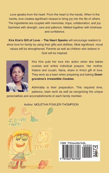 Love speaks from the heart. From the heart to the hands. When in the hands, love creates significant recipes to bring joy into the life of others. The ingredients are coupled with memories, hope, collaboration, and joy. Sprinkled with strength, care and patience. Melted together with kindness and confidence. Kira Kire's Gift of Love -- The Heart Speaks will encourage readers to show love for family by using their gifts and abilities. Most significant, moral values will be strengthened. Parents as well as children who believe in God will be inspired. Kira Kire puts her love into action when she bakes cookies and writes individual prayers. Her mother, Kalene and cousin, Nana, share in Kira's gift of love. They work as a team when preparing and baking Great-grandma's Irresistible Cookies. Admirably is their preparation. This required time, patience, team work as well as recognizing the unique personalities and accomplishments of each family member. Author: MOLETHA FOWLER-THOMPSON