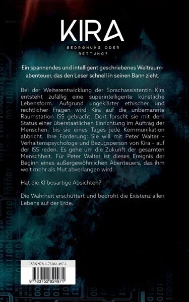 Ein spannendes und intelligent geschriebenes Weltraumabenteuer, das den Leser schnell in seinen Bann zieht.Bei der Weiterentwicklung der Sprachassistentin Kira entsteht zufällig eine superintelligente künstliche Lebensform. Aufgrund ungeklärter ethischer und rechtlicher Fragen wird Kira auf die unbemannte Raumstation ISS gebracht. Dort forscht sie mit dem Status einer überstaatlichen Einrichtung im Auftrag der Menschen, bis sie eines Tages jede Kommunikation abbricht. Ihre Forderung: Sie will mit Peter Walter, Verhaltenspsychologe und Bezugsperson von Kira, auf der ISS reden. Es gehe um die Zukunft der gesamten Menschheit. Für Peter Walter ist dieses Ereignis der Beginn eines außergewöhnlichen Abenteuers, das ihm weit mehr als Mut abverlangen wird.Hat die KI bösartige Absichten?Die Wahrheit erschüttert und bedroht die Existenz allen Lebens auf der Erde.