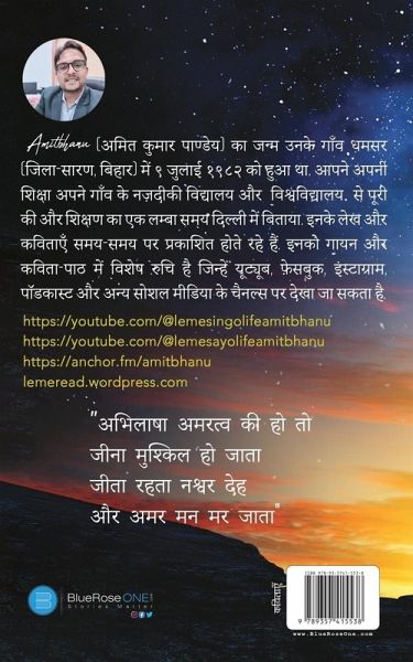 Amitbhanu (Amit Kumar Pandey) was born on 9 July 1982 in Chapra, Bihar. He has done his schooling and college from the nearest school and college in Bihar. He is an officer of the Indian Revenue Service and presently works as Additional Commissioner in the Income Tax Department. His area of interest is wide and varied which includes reading, writing, poetry, singing/music, running, cycling, etc. He shares his stuff on various social media platforms like Youtube, Facebook, Instagram, Twitter, etc. He also shares book reviews and his poems on his website and podcasts. He can be followed by following links given below: https://spotifyanchor-web.app.link/e/aibVFFZM5yb http://lemeread.wordpress.com/ https://www.youtube.com/channel/UC1XtiOEOKUh7KX8dLjVvZng https://www.youtube.com/channel/UCb7e-k44yE20Q5GjdI3CiAQ https://www.facebook.com/amitbhanu.pandey https://instagram.com/letmereadolife/ twitter@amitpirs