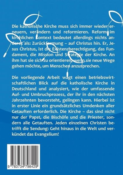 Die katholische Kirche ist eine Ecclesia semper reformanda, also eine Kirche, die sich immer wieder erneuern, verändern und reformieren muss. Reform im kirchlichen Kontext bedeutet nichts anderes als: Zurückformung - auf Christus hin. Er, Jesus Christus, ist die Existenzberechtigung, das Fundament, die Mission und Strategie der Kirche. An ihm hat sie sich immer wieder zu orientieren, wenn sie neue Wege gehen möchte, um Menschen anzusprechen.Die vorliegende Arbeit wagt einen betriebswirtschaftlichen Blick auf die katholische Kirche in Deutschland und analysiert, wie der umfassende Auf- und Umbruchprozess, der sich der Kirche in den nächsten Jahrzehnten stellen wird, gelingen kann. Hierbei ist in erster Linie ein grundsätzliches Umdenken aller Getauften erforderlich. Die Kirche - das sind nicht nur Papst, Bischöfe und Priester, sondern alle Getauften. Jeden einzelnen Christen betrifft die Sendung: Geht hinaus in die Welt und verkündet das Evangelium!Die Kirche hat keinen Selbstzweck. Vielmehr ist es an der Zeit, dass sie ihre Mission und Kernkompetenz wieder neu entdeckt, nämlich das Evangelium zu den Menschen zu bringen. Insofern ist Papst Franziskus eine "verbeulte" Kirche, die verletzt und beschmutzt ist, weil sie auf die Straßen hinausgegangen ist, lieber, als eine Kirche, die aufgrund ihrer Verschlossenheit und ihrer Bequemlichkeit, sich an die eigenen Sicherheiten zu klammern, krank ist.
