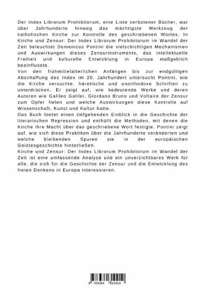 Der Index Librorum Prohibitorum, eine Liste verbotener Bücher, war über Jahrhunderte hinweg das mächtigste Werkzeug der katholischen Kirche zur Kontrolle des geschriebenen Wortes. In Kirche und Zensur: Der Index Librorum Prohibitorum im Wandel der Zeit beleuchtet Domenicus Pontini die vielschichtigen Mechanismen und Auswirkungen dieses Zensurinstruments, das intellektuelle Freiheit und kulturelle Entwicklung in Europa maßgeblich beeinflusste.Von den frühmittelalterlichen Anfängen bis zur endgültigen Abschaffung des Index im 20. Jahrhundert untersucht Pontini, wie die Kirche versuchte, häretische und unorthodoxe Schriften zu unterdrücken. Er zeigt auf, wie bedeutende Werke und deren Autoren wie Galileo Galilei, Giordano Bruno und Voltaire der Zensur zum Opfer fielen und welche Auswirkungen diese Kontrolle auf Wissenschaft, Kunst und Kultur hatte.Das Buch bietet einen tiefgehenden Einblick in die Geschichte der literarischen Repression und enthüllt die Methoden, mit denen die Kirche ihre Macht über das geschriebene Wort festigte. Pontini zeigt auf, wie sich diese Praktiken über die Jahrhunderte veränderten und welche bleibenden Spuren sie in der europäischen Geistesgeschichte hinterließen.Kirche und Zensur: Der Index Librorum Prohibitorum im Wandel der Zeit ist eine umfassende Analyse und ein unverzichtbares Werk für alle, die sich für die Geschichte der Zensur und die Entwicklung des freien Denkens in Europa interessieren.
