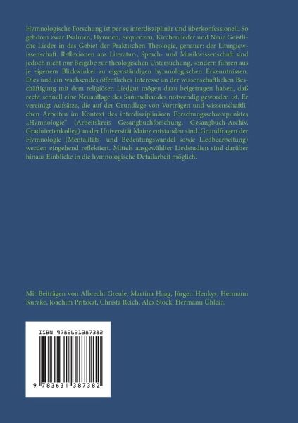 Hymnologische Forschung ist per se interdisziplinär und überkonfessionell. So gehören zwar Psalmen, Hymnen, Sequenzen, Kirchenlieder und Neue Geistliche Lieder in das Gebiet der Praktischen Theologie, genauer: der Liturgiewissenschaft. Reflexionen aus Literatur-, Sprach- und Musikwissenschaft sind jedoch nicht nur Beigabe zur theologischen Untersuchung, sondern führen aus je eigenem Blickwinkel zu eigenständigen hymnologischen Erkenntnissen. Dies und ein wachsendes öffentliches Interesse an der wissenschaftlichen Beschäftigung mit dem religiösen Liedgut mögen dazu beigetragen haben, daß recht schnell eine Neuauflage des Sammelbandes notwendig geworden ist. Er vereinigt AufsNeuauflage des Sammelbandes notwendig geworden ist. Er vereinigt Aufsätze, die auf der Grundlage von Vorträgen und wissenschaftlichen Arbeiten im Kontext des interdisziplinären Forschungsschwerpunktes "Hymnologie" (Arbeitskreis Gesangbuchforschung, Gesangbuch-Archiv, Graduiertenkolleg) an der Universität Mainz entstanden sind. Grundfragen der Hymnologie (Mentalitäts- und Bedeutungswandel sowie Liedbearbeitung) werden eingehend reflektiert. Mittels ausgewählter Liedstudien sind darüber hinaus Einblicke in die hymnologische Detailarbeit möglich.
