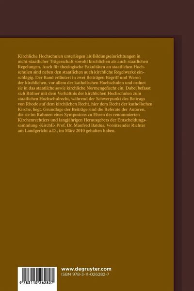 Kirchliche Hochschulen unterliegen als Bildungseinrichtungen in nicht-staatlicher Trägerschaft sowohl kirchlichen als auch staatlichen Regelungen. Auch für theologische Fakultäten an staatlichen Hochschulen sind neben den staatlichen auch kirchliche Regelwerke einschlägig. Der Band erläutert in zwei Beiträgen Begriff und Wesen der kirchlichen, vor allem der katholischen Hochschulen und ordnet sie in das staatliche sowie kirchliche Normengeflecht ein. Dabei befasst sich Rüfner mit dem Verhältnis der kirchlichen Hochschulen zum staatlichen Hochschulrecht, während der Schwerpunkt des Beitrags von Rhode auf dem kirchlichen Recht, hier dem Recht der katholischen Kirche, liegt.