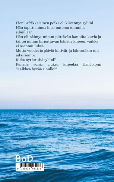 Pieni, afrikkalainen poika oli kiivennyt syliini. Hän tapitti minua linja-autossa tummilla silmillään. Hän oli nähnyt minun piirtävän kauniita kuvia ja tahtoi minun kirjoittavan hänelle kirjeen, vaikka ei osannut lukea Mutta vuodet ja päivät kiitivät, ja hänestäkin tuli aikuisempi. Kuka nyt istuisi syliini? Kenelle voisin pukea kirjeeksi läsnäoloni: "Kaikkea hyvää sinulle?"