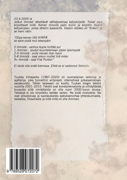 ''22.2.2005 ti Joku vauva oli syntynyt niin, että hän oli päästään kiinni toisessa vauvassa, jolla kuitenkin oli alikehittynyt vartalo. Pää möhkälemäisine vartaloineen poistettiin kirurgisesti. Uutinen ihmetytti minua sikäli, että pää vain 'poistettiin'. Kuitenkin se pystyi välillä räpyttelemään silmiään ja hymyilemään. Se oli ilmeisestikin tietoinen olento, mitä sille tehtiin? Tapettiinko se ennen leikkausta, vai revittiinkö se vain irti ja sitten heitettiin purkkiin, jossa lukee 'Medical Waste'? Tähänhän sisältyy eettinen kannanotto: tapetaan heikompi organismi vahvemman eduksi. Jonkun ekofasistin pitäisi suuttua moisesta näkemyksestä, mutta kukaan ei suutu. Tämä johtunee siitä, että eläimet ovat söpöjä kun taas epämuodostuneet vauvat ovat rumia. No, ehkä olen nyt hieman yksinkertaistanut asioita.'' Tähän teokseen on koottu Tuukka Virtaperkon (1987-2020) blogin tekstit vuosilta 2001-2010. Tekstit ovat konstailematonta ja viihdyttävää kuvausta siitä minkälaista on olla nuori 2000-luvulla. Ne ovat provosoivaa ajatuksenvirtaa yhteiskunnasta, taiteesta, filosofiasta ja siitä mitä on olla ihminen.