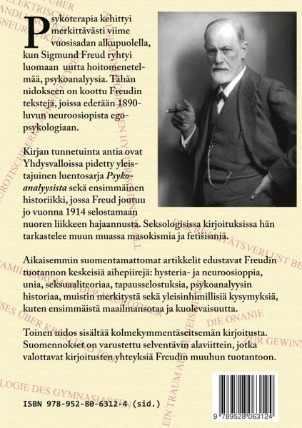 Kirjaan on koottu Sigmund Freudin artikkeleita, jotka edustavat hänen tuotantonsa keskeisiä aihepiirejä: hysteria- ja neuroosioppia, unitutkimusta, seksuaaliteoriaa, tapausselostuksia, psykoanalyysin historiaa, muistin merkitystä sekä yleisinhimillisiä kysymyksiä, kuten ensimmäistä maailmansotaa ja kuolevaisuutta. Valikoiman artikkelit ilmestyvät nyt ensi kertaa suomeksi. 1. Peitemuistoista 2. Tunnusmerkistön määritys ja psykoanalyysi 3. Hysteriakuvitelmat ja niiden yhteys biseksuaalisuuteen 4. Neurootikon perheromaani 5. Psykoanalyysista 6. Hysteriakohtauksen yleispiirteitä 7. Psykogeeninen näköhäiriö psykoanalyyttisesti ymmärrettynä 8. Unet kansanperinteessä 9. Neuroottisista sairastumislajeista 10. Itsetyydytys 11. Pakkoneuroosialttius 12. Uni todistuskappaleena 13. Satuaineksia unissa 14. Psykoanalyyttisen liikkeen historiaa 15. Kymnaasinoppilaan psykologiaa 16. Mietteitä sodan ja kuoleman aikana 17. Kuvallisen pakkomielteen mytologisia vastineita 18. Vertauskuvan ja oireen yhteys 19. Vietinmuuntumista, varsinkin anaalierotiikassa 20. Lasta piestään 21. Esipuhe Theodor Reikin kirjaan Probleme der Religionspsychologie 22. Lausunto sotaneurootikkojen sähköhoitokäsittelystä 23. Analyysitekniikan esihistoriasta 24. Nelivuotiaan lapsen mielleyhtymä 25. Mustasukkaisuuden, vainoharhan ja homoseksuaalisuuden neuroottisista mekanismeista 26. Josef Popper-Lynkeus ja uniteoria 27. Neuroosi ja psykoosi 28. Masokismin viettitaloudellinen ongelma 29. Todellisuuskato neuroosissa ja psykoosissa 30. Alkuhuomautus E. Pickworth Farrow'n artikkeliin 31. Fetishismi 32. Halsmannin jutun asiantuntijalausunto 33. Tulen taltuttamisesta 34. Yhteyteni Josef Popper-Lynkeukseen 35. Hienovarainen virhesuoritus 36. Egon lohkoutuminen puolustautumisprosessissa 37. Psykoanalyysin alkeisoppia Suomennokset on varustettu selventävin alaviittein, jotka valottavat kirjoitusten yhteyksiä Freudin muuhun tuotantoon. Kovakantinen (lankasidonta).