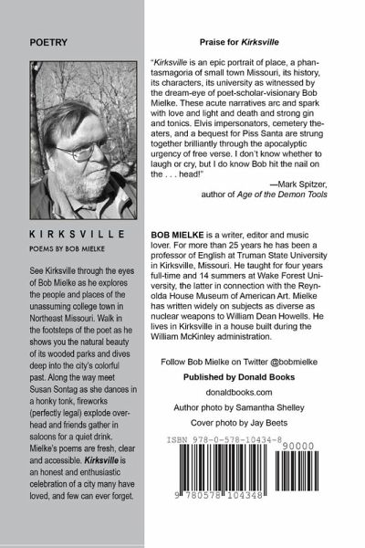 See Kirksville through the eyes of Bob Mielke as he explores the people and places of the unassuming college town in Northeast Missouri. Walk in the footsteps of the poet as he shows you the natural beauty of its wooded parks and dives deep into the city's colorful past. Along the way meet Susan Sontag as she dances in a honky tonk, fireworks (perfectly legal) explode overhead and friends gather in saloons for a quiet drink. Mielke's poems are fresh, clear and accessible. Kirksville is an honest and enthusiastic celebration of a city many have loved, and few can ever forget.