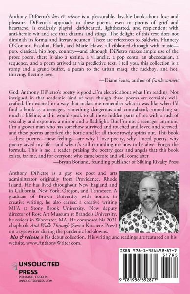 A meditation in a rush, kiss & release is driven by the intense voice of an observant, insistent & emotional "I." He's an urban gay man who admits he's here with a date, but you never know how the night will end. He has several loves, at least a few fuckboys, and many questions: most spells are made with words & broken by a kiss, why not the other way around? what is more intimate than a whisper? how long will yr wife be gone? Have you ever noticed it? asks "Love Is Finished Again," a poem cycle revealed in seven movements. The sequence muses on how we end up in the same place over & over in sex & love & everything. The only real change is through decay that makes ruins, noseless busts, caves of Pompeii, brothel rooms. Even language & communication decay, as a number of mashup and collaborative poems explore. Are you ready for the beats? This book is a party and a romance. It's a lucid dream. This poetry accuses, brags, confesses, obsesses, panics & promises. It discos, raves & swings. It falls in love during a hookup but gets bored at a four-way. It woos the Zodiac; tries to get its virginity back; invents sex as a religion, mythologizes masculinity & succumbs to its devils; kills a snake to resurrect a lover; gives a blowjob at a dirty book store; goes to see bad performance art; looks for love & finds it everywhere/wherever.