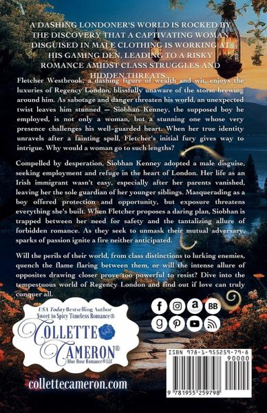 A dashing Londoner's world is rocked by the discovery that a captivating woman disguised in male clothing is working at his gaming den, leading to a risky romance amidst class struggles and hidden threats... Fletcher Westbrook, a dashing figure of wealth and wit, enjoys the luxuries of Regency London, blissfully unaware of the storm brewing around him. As sabotage and danger threaten his world, an unexpected twist leaves him stunned - Siobhan Kenney, the supposed boy he employed, is not only a woman, but a stunning one whose very presence challenges his well-guarded heart. When her true identity unravels after a fainting spell, Fletcher's initial fury gives way to intrigue. Why would a woman go to such lengths? Compelled by desperation, Siobhan Kenney adopted a male disguise, seeking employment and refuge in the heart of London. Her life as an Irish immigrant wasn't easy, especially after her parents vanished, leaving her the sole guardian of her younger siblings. Masquerading as a boy offered protection and opportunity, but exposure threatens everything she's built. When Fletcher proposes a daring plan, Siobhan is trapped between her need for safety and the tantalizing allure of forbidden romance. As they seek to unmask their mutual adversary, sparks of passion ignite a fire neither anticipated. Will the perils of their world, from class distinctions to lurking enemies, quench the flame flaring between them, or will the intense allure of opposites drawing closer prove too powerful to resist? Dive into the tempestuous world of Regency London and find out if love can truly conquer all. ________________________________________________________________ Secrets, Suspense, and Swoon-Worthy Romance... If you enjoy reading historical romances featuring lovable rogues, enemies to lovers, second chances, class differences, forced proximity, mistaken identities, and opposites attract, you'll adore USA Today Bestselling author Collette Cameron's captivating series: CHRONICLES OF THE WESTBROOK BRIDES. These evocative and compelling tales are infused with a pinch of mystery and suspense, a dash of humor, and a splash of soul-searing emotion. Settle into a cozy reading nook with your favorite beverage and escape into this page-turning, entertaining Regency romance series. Though each book can be read as a stand-alone, readers prefer to enjoy the series in order. CHRONICLES OF THE WESTBROOK BRIDES: Midnight Christmas Waltz Mission at Midnight The Midnight Marquess Holly, Mistletoe, & Midnight Snow The Wallflower's Midnight Waltz Minuet at Midnight Kiss a Rake at Midnight Unmasked at Midnight Memories Made at Midnight Once Upon a Midnight Dream CHECK OUT USA TODAY BESTSELLING AUTHOR, COLLETTE CAMERON'S COMPLETE LIBRARY OF REGENCY AND SCOTTISH HIGHLANDER ROMANCE SERIES: Chronicles of the Westbrook Brides Dukes Come Calling For the Love of an Earl Heart of a Scot Highland Heather Romancing a Scot: Castle Brides Secrets of Scandalous Ladies The Culpepper Misses The Honorable Rogues(R)