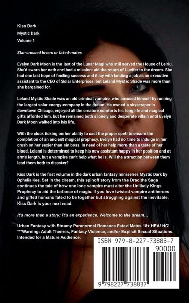 Kiss Dark Mystic Dark Volume 1 Star-crossed lovers or fated-mates Evelyn Dark Moon is the last of the Lunar Magi who still served the House of Leiriu. She'd sworn her oath and had a mission: aid the return of Lucifer to the dream. She had one last hope of finding success and it lay with landing a job as an executive assistant to the CEO of Solar Enterprises, but Leland Mystic Shade was more than she bargained for. Leland Mystic Shade was an old criminal vampire, who amused himself by running the largest solar energy company in the dream. He owned a skyscraper in downtown Chicago, enjoyed all the creature comforts his long life and magical gifts afforded him, but he remained both a lonely and desperate villain until Evelyn Dark Moon walked into his life. With the clock ticking on her ability to cast the proper spell to ensure the completion of an ancient magical prophecy, Evelyn had no time to indulge in her crush on her sexier than sin boss. In need of her help more than a taste of her blood, Leland is determined to keep his new assistant happy in her position and at arm's length, but a vampire can't help what he is. Will the attraction between them lead them both to disaster? Kiss Dark is the first volume in the dark urban fantasy miniseries Mystic Dark by Ophelia Kee. Set in the dream, this spinoff story from the Draoithe Saga continues the tale of how one lone vampire must alter the Unlikely Kings Prophecy to aid the balance of magic. If you love twisted vampire antiheroes and gifted humans fated to be together but struggling against the inevitable, Kiss Dark is your next read. It's more than a story; it's an experience. Welcome to the dream... Urban Fantasy with Steamy Paranormal Romance Fated Mates 18+ HEA! NC! ***Warning: Adult Themes, Fantasy Violence, and/or Explicit Sexual Situations. Intended for a Mature Audience.