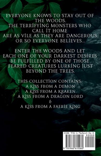 Included in this collection are four novellas about desperate human women and the monstrous creatures who come to their rescue. Never enter The Woods unless you want to stay forever. A Kiss From a Demon: Willing to offer up her maidenhood in exchange for not having to marry a cruel duke, Irys enters into a bargain with demon Asgorath. Little does she know she's getting much more than she bargained for when the demon decides to keep her all to himself...forever. A Kiss From a Kraken: Melody has had enough of her father's greed. Unfortunately for her, his latest debauched act has led the feared Kraken straight to their door, and he will only accept Melody as payment for what her father stole. Try as she might to hate him. Life with the Kraken is not what she expected. Can Melody keep her heart intact, or will the kraken steal it just as he has her? A Kiss From a Dragon Lord: On the run from her past, Anwyn seeks shelter one stormy night in a cave, unbeknownst that its current inhabitant is one possessive dragon lord. One look at Anwyn, and Lassar knows that he's found the greatest treasure of all. When her village comes to rescue her, will she follow her heart and stay with the dragon, or return to the human world and face an uncertain future? A Kiss From a Faerie King: After one bold act of kindness, Laurelle finds herself fleeing from her rigid human life and tumbling head-first into the faerie realm. There, she meets their monstrous king, Emrys, who declares she belongs to him. Will she flee the first chance she gets? Or will she let this newfound attraction blossom between her and the king?