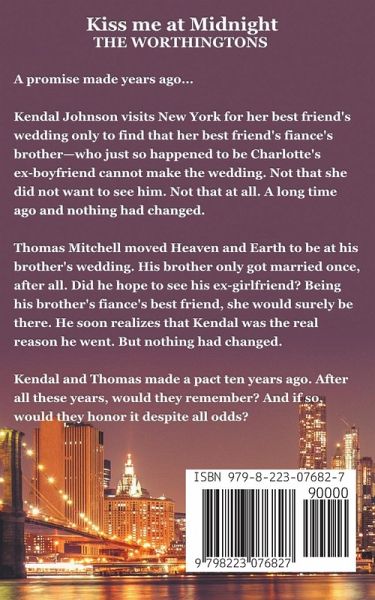 A promise made years ago... Kendal Johnson visits New York for her best friend's wedding only to find that her best friend's fiance's brother-who just so happened to be Charlotte's ex-boyfriend cannot make the wedding. Not that she did not want to see him. Not that at all. A long time ago and nothing had changed. Thomas Mitchell moved Heaven and Earth to be at his brother's wedding. His brother only got married once, after all. Did he hope to see his ex-girlfriend? Being his brother's fiance's best friend, she would surely be there. He soon realizes that Kendal was the real reason he went. But nothing had changed. Kendal and Thomas made a pact ten years ago. After all these years, would they remember? And if so, would they honor it despite all odds? For a sparklingly romantic emotional and touching sweet romantic comedy loaded with love-at-first-sight and happily-ever-after, read Kiss Me at Midnight and fall in love along with Kendal and Thomas all over again.