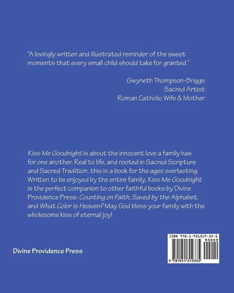 Kiss Me Goodnight is about the innocent love a family has for one another. Real to life, and rooted in Sacred Scripture and Sacred Tradition, this is a book for the ages everlasting. Written to be enjoyed by the entire family, Kiss Me Goodnight is the perfect companion to other faithful books by Divine Providence Press: Counting on Faith, Saved by the Alphabet, and What Color is Heaven? May God bless your family with the wholesome kiss of eternal joy!