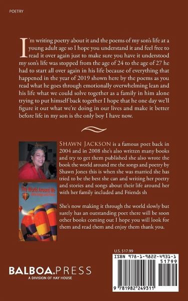 And I'm writing poetry about it and the poems of my son's life at a young adult age so I hope you understand it and feel free to read it over again just to make sure you have it understood my son's life was stopped from the age of 24 to the age of 27 he had to start all over again in his life because of everything that happened in the year of 2019 shown here by the poems as you read what he goes through emotionally overwhelming lean and his life what we could solve together as a family in him alone trying to put himself back together I hope that he one day we'll figure it out what we're doing in our lives and make it better before life in my son is the only boy I have now.