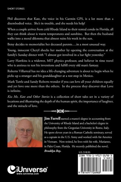 Phil discovers that Kate, the voice in his Garmin GPS, is a lot more than a disembodied voice. She's in trouble, and she needs his help! When a couple arrives from cold Rhode Island to their rented condo in Florida, all they can think about is warm temperatures and sunshine. But then the husband walks into a moral dilemma that almost ruins his week in the sun. Betsy decides to memorialize her deceased parents….in a most unusual way. Young, innocent Cheryl shocks her mother by opening the conversation at the family's Sunday dinner with "I almost got involved in a bar fight yesterday." Larry Hawkins is a widower, MIT physics professor, and believer in time travel who is anxious to test his inventions and fulfill every old man's fantasy. Roberto Villarreal has no idea a life-changing adventure is about to begin when he picks up a stranger and his granddaughter at a rest stop in Mexico. Mark Tuttle and Sandy Roberts wonder if you can love all your children equally and yet love one more than the others. In the process they discover that Love is infinite. Kiss Me, Kate and Other Stories is a collection of short tales set in a variety of locations and illustrating the depth of the human spirit, the importance of laughter, and the miracle of love.