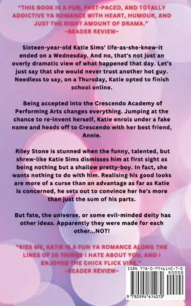 Sixteen-year-old Katie Sims' life-as-she-knew-it ended on a Wednesday. And no, that's not just an overly dramatic view of what happened that day. Let's just say that she would never trust another hot guy. Needless to say, on a Thursday, Katie opted to finish school online. Until she's accepted into the Crescendo Academy of Performing Arts. Jumping at the chance to re-invent herself, Katie enrols under a fake name and heads off to Crescendo with her best friend, Annie. Riley Stone is stunned when the funny, talented, but shrew-like Katie Sims dismisses him at first sight as being nothing but a shallow, pretty-boy. In fact, she wants nothing to do with him. Realising his good looks are more of a curse than an advantage as far as Katie is concerned, he sets out to convince her he's more than just the sum of his parts. But apparently, fate, the universe, or some evil-minded deity has other ideas. Seems they were made for each other...NOT!