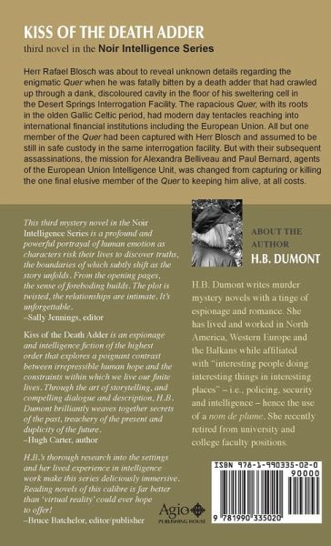 Herr Rafael Blosch was about to reveal unknown details regarding the enigmatic Quer when he was fatally bitten by a death adder that had crawled up through a dank, discoloured cavity in the floor of his sweltering cell in the Desert Springs Interrogation Facility. The rapacious Quer, with its roots in the olden Gallic Celtic period, had modern day tentacles reaching into international financial institutions including the European Union. All but one member of the Quer had been captured with Herr Blosch and assumed to be still in safe custody in the same interrogation facility. But with their subsequent assassinations, the mission for Alexandra Belliveau and Paul Bernard, agents of the European Union Intelligence Unit, was changed from capturing or killing the one final elusive member of the Quer to keeping him alive, at all costs.