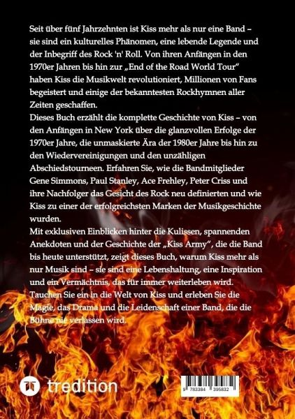 Seit über fünf Jahrzehnten ist Kiss mehr als nur eine Band - sie sind ein kulturelles Phänomen, eine lebende Legende und der Inbegriff des Rock 'n' Roll. Von ihren Anfängen in den 1970er Jahren bis hin zur "End of the Road World Tour" haben Kiss die Musikwelt revolutioniert, Millionen von Fans begeistert und einige der bekanntesten Rockhymnen aller Zeiten geschaffen.Dieses Buch erzählt die komplette Geschichte von Kiss - von den Anfängen in New York über die glanzvollen Erfolge der 1970er Jahre, die unmaskierte Ära der 1980er Jahre bis hin zu den Wiedervereinigungen und den unzähligen Abschiedstourneen. Erfahren Sie, wie die Bandmitglieder Gene Simmons, Paul Stanley, Ace Frehley, Peter Criss und ihre Nachfolger das Gesicht des Rock neu definierten und wie Kiss zu einer der erfolgreichsten Marken der Musikgeschichte wurden.Mit exklusiven Einblicken hinter die Kulissen, spannenden Anekdoten und der Geschichte der "Kiss Army", die die Band bis heute unterstützt, zeigt dieses Buch, warum Kiss mehr als nur Musik sind - sie sind eine Lebenshaltung, eine Inspiration und ein Vermächtnis, das für immer weiterleben wird.Tauchen Sie ein in die Welt von Kiss und erleben Sie die Magie, das Drama und die Leidenschaft einer Band, die die Bühne nie verlassen wird.
