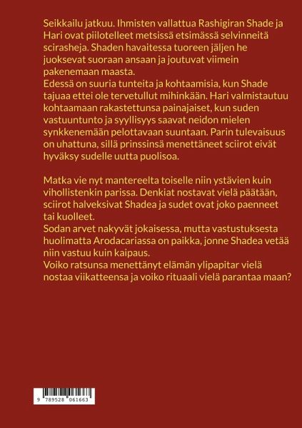 Seikkailu jatkuu. Ihmisten vallattua Rashigiran Shade ja Hari ovat piilotelleet metsissä etsimässä selvinneitä scirasheja. Shaden havaitessa tuoreen jäljen he juoksevat suoraan ansaan ja joutuvat viimein pakenemaan maasta. Edessä on suuria tunteita ja kohtaamisia, kun Shade tajuaa ettei ole tervetullut mihinkään. Hari valmistautuu kohtaamaan rakastettunsa painajaiset, kun suden vastuuntunto ja syyllisyys saavat neidon mielen synkkenemään pelottavaan suuntaan. Parin tulevaisuus on uhattuna, sillä prinssinsä menettäneet sciirot eivät hyväksy sudelle uutta puolisoa. Matka vie nyt mantereelta toiselle niin ystävien kuin vihollistenkin parissa. Denkiat nostavat vielä päätään, sciirot halveksivat Shadea ja sudet ovat joko paenneet tai kuolleet. Sodan arvet nakyvät jokaisessa, mutta vastustuksesta huolimatta Arodacariassa on paikka, jonne Shadea vetää niin vastuu kuin kaipaus. Voiko ratsunsa menettänyt elämän ylipapitar vielä nostaa viikatteensa ja voiko rituaali vielä parantaa maan?