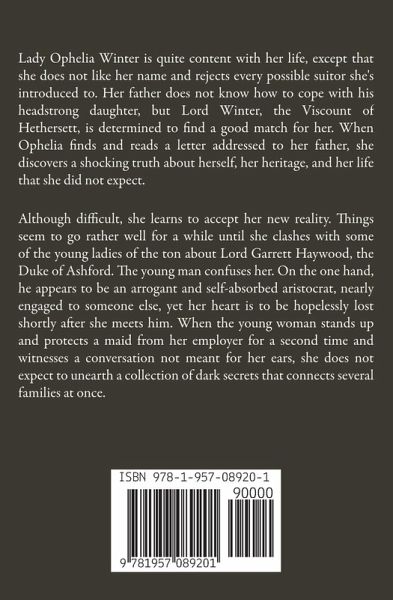 Lady Ophelia Winter is quite content with her life, except that she does not like her name and rejects every possible suitor she's introduced to. Her father does not know how to cope with his headstrong daughter, but Lord Winter, the Viscount of Hethersett, is determined to find a good match for her. When Ophelia finds and reads a letter addressed to her father, she discovers a shocking truth about herself, her heritage, and her life that she did not expect. Although difficult, she learns to accept her new reality. Things seem to go rather well for a while until she clashes with some of the young ladies of the ton about Lord Garrett Haywood, the Duke of Ashford. The young man confuses her. On the one hand, he appears to be an arrogant and self-absorbed aristocrat, nearly engaged to someone else, yet her heart is to be hopelessly lost shortly after she meets him. When the young woman stands up and protects a maid from her employer for a second time and witnesses a conversation not meant for her ears, she does not expect to unearth a collection of dark secrets that connects several families at once.