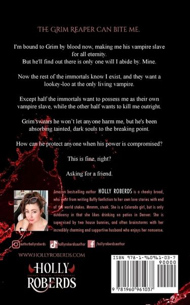 The Grim Reaper can bite me. I'm bound to Grim by blood now, making me his vampire slave for all eternity. But he'll find out there is only one will I abide by. Mine. Now the rest of the immortals know I exist, and they want a lookey-loo at the only living vampire. Except half the immortals want to possess me as their own vampire slave, while the other half wants to kill me outright. Grim swears he won't let anyone harm me, but he's been absorbing tainted, dark souls to the breaking point. How can he protect anyone when his power is compromised? This is fine, right? Asking for a friend. Read Kissed by Death: Book Two if your dying for an immature yet kickass heroine, alpha hero, cheeky humor, and a slow burn to steamy series. *Make sure to read book one: Bitten by Death first, before diving into this second installment. You won't regret it.*