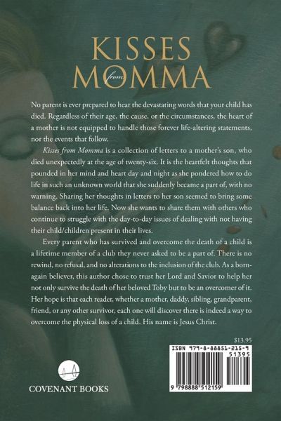 No parent is ever prepared to hear the devastating words that your child has died. Regardless of their age, the cause, or the circumstances, the heart of a mother is not equipped to handle those forever life-altering statements, nor the events that follow. Kisses from Momma is a collection of letters to a mother's son, who died unexpectedly at the age of twenty-six. It is the heartfelt thoughts that pounded in her mind and heart day and night as she pondered how to do life in such an unknown world that she suddenly became a part of, with no warning. Sharing her thoughts in letters to her son seemed to bring some balance back into her life. Now she wants to share them with others who continue to struggle with the day-to-day issues of dealing with not having their child/children present in their lives. Every parent who has survived and overcome the death of a child is a lifetime member of a club they never asked to be a part of. There is no rewind, no refusal, and no alterations to the inclusion of the club. As a born-again believer, this author chose to trust her Lord and Savior to help her not only survive the death of her beloved Toby but to be an overcomer of it. Her hope is that each reader, whether a mother, daddy, sibling, grandparent, friend, or any other survivor, each one will discover there is indeed a way to overcome the physical loss of a child. His name is Jesus Christ.