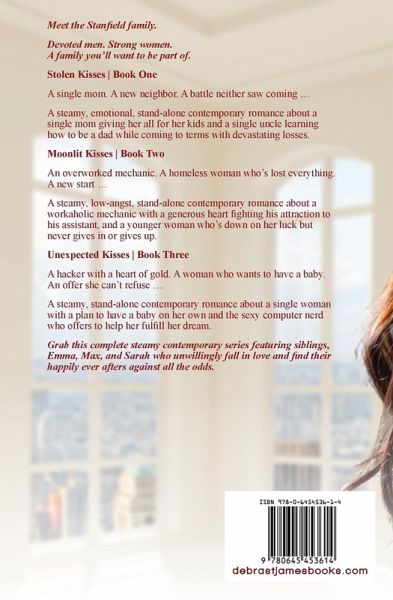 Meet the Stanfield family. Devoted men. Strong women. A family you'll want to be part of. Stolen Kisses Book One A single mom. A new neighbor. A battle neither saw coming ... A steamy, emotional, stand-alone contemporary romance about a single mom giving her all for her kids and a single uncle learning how to be a dad while coming to terms with devastating losses. Moonlit Kisses Book Two An overworked mechanic. A homeless woman who's lost everything. A new start ... A steamy, low-angst, stand-alone contemporary romance about a workaholic mechanic with a generous heart fighting his attraction to his assistant, and a younger woman who's down on her luck but never gives in or gives up. Unexpected Kisses Book Three A hacker with a heart of gold. A woman who wants to have a baby. An offer she can't refuse ... A steamy, stand-alone contemporary romance about a single woman with a plan to have a baby on her own and the sexy computer nerd who offers to help her fulfill her dream. Grab this complete steamy contemporary series featuring siblings, Emma, Max, and Sarah who unwillingly fall in love and find their happily ever afters against all the odds.