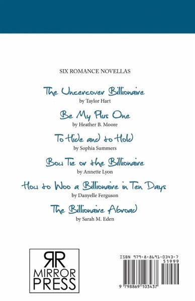 Money doesn't equal happiness. But sometimes it paves the way . . . THE UNDERCOVER BILLIONAIRE by Taylor Hart When billionaire, Mia Jagger, goes to Wyoming to evaluate a ranch in foreclosure, she never anticipates falling and hitting her head. When she wakes up and doesn't remember who she is, she's afraid, and all she wants is that blue-eyed man who held her hand in the hospital. Ross Charm doesn't want to take a woman who can't remember anything back to his ranch, but she keeps insisting and he can't leave her on her own. When her family shows up and they both learn the truth, they must make a choice: let the past keep them apart or let true love have its' happily ever after. BE MY PLUS ONE by Heather B. Moore Amanda Wurst has been preparing for months to meet with a group of venture capitalists and get funding for her app, but in the meeting, she's humiliated. Packing up her things, she takes off for the elevator, only to be joined by Jeremy Lode, the president. He apologizes and offers her a partnership for her new app product. At first, Amanda wants to turn him down out of pride, but his offer is too good to refuse. Besides, Jeremy Lode is an intriguing man in more ways than one. TO HIDE AND TO HOLD by Sophia Summers Lake Tahoe never looked as good as it did the day Chad meets Grace. But when his own life spirals into crazy with his parents trying to set him up with a woman, he's happy to keep things on a first name basis with Grace. Brilee Grace Townsend loves her eggshell camper, her campground, and her Huskie. Hiding out while she writes about working with a Senator and then walking out on her parents and fortune, seemed like the best part of her Spring until she met Chad. When Chad discovers Grace is the very girl both their parents hoped he would date, he couldn't be happier. When Grace finds out, she never wants to speak to him again. BOW TIE OR THE BILLIONAIRE by Annette Lyon Lauren has built a cosmetics empire and now lives a great life in Europe, with more money than she could ever spend. But business life has taken a toll; she yearns to return to the laboratory. She's decided to partner with Carmichael Enterprises. But when she meets the head of the company, it's clear Carmichael has no intention of continuing her charitable donations. Worse, he wants to move the headquarters. Too bad she can't partner with Carmichael's assistant, Eric. He's smart, funny, and kind. He even visits sick children in hospitals as Bow Tie the Clown. Lauren finds herself falling for Eric, but chances are slim of that anything can come of it, not when she's about to cut off negotiations with his billionaire boss. HOW TO WOO A BILLIONAIRE IN TEN DAYS by Danyelle Ferguson Love is the last thing on billionaire Penny's mind, but when her grandparents dangle a seat on the Wessex Resorts board of directors in exchange for her entering the dating scene, Penny takes the challenge. Mac is at the resort for a hockey player's bachelor party. When one of the rich players flirts with Penny and gets rejected, he bets run-of-the-mill Mac can't get a date with her. With every date, Mac's bet fund for his business grows, but so do his feelings for Penny. As time runs out, he'll have to choose between wooing the billionaire for money or for love. THE BILLIONAIRE ABROAD by Sarah M. Eden When bachelor billionaire Sterling Westcott hires Keighley Ainsworth to plan an important event in Dublin, she jumps at the opportunity. Time alone with her budding crush in a city she's always wanted to visit? Yes, please! But event planner Brogan Malone soon weaves a spell of his own, making her question everything she thinks her heart wants. Kissing a Billionaire is a Timeless Romance Anthology® book