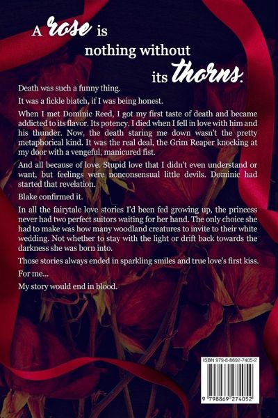 A rose is nothing without its thorns... Death was such a funny thing. It was a fickle biatch, if I was being honest. When I met Dominic Reed, I got my first taste of death and became addicted to its flavor. Its potency. I died when I fell in love with him and his thunder. Now, the death staring me down wasn't the pretty metaphorical kind, but the kind that chased you down until your heart gave out. And all because of love. Stupid love that I didn't even understand or want, but feelings were nonconsensual little devils. Dominic had started that revelation. Blake confirmed it. In all the fairytale love stories I'd been fed growing up, the princess never had two suitors waiting for her hand. The only choice she had to make was how many woodland creatures to invite to their white wedding. Not whether to stay with the light or drift back towards the darkness she was born into. Those stories always ended in sparkling smiles and true love's first kiss. For me... My story would end in blood.