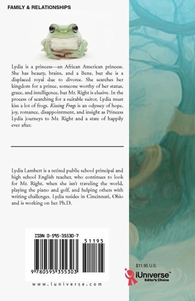 Lydia is a princess-an African American princess. She has beauty, brains, and a Benz, but she is a displaced royal due to divorce. She searches her kingdom for a prince, someone worthy of her status, grace, and intelligence, but Mr. Right is elusive. In the process of searching for a suitable suitor, Lydia must kiss a lot of frogs. Kissing Frogs is an odyssey of hope, joy, romance, disappointment, and insight as Princess Lydia journeys to Mr. Right and a state of happily ever after.