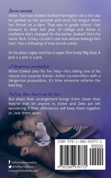 Sworn enemies Asher Tran has disliked Ezekiel Harrington since the day he yanked on her ponytail and stuck his tongue down her throat on a dare. That was in grade school. Fast-forward to their last year of college and Asher is confident she's changed for the better. Ezekiel? He's the same. Rich. Cocky. Couldn't care less whose feelings he's hurt. Has a following of love-struck coeds. So he plays rugby and has a super fine body? Big deal. A jerk is a jerk is a jerk. A dangerous proposition When Ezekiel asks for her help-he's failing one of his classes (no surprise there)-Asher counteroffers with a dangerous proposition. It's time someone reforms the bad boy. Putting their hearts on the line But when their arrangement brings them closer than they've ever let anyone in, Asher and Zeke are left wondering whether their differences will keep them together or... tear them apart. Author note: Zeke, Galley, José, Tyler and Mauricio--"the guys"--in Kissing Game have filthy mouths. Worship the f-bomb. But they're filthy hot, too. Read at your own risk.