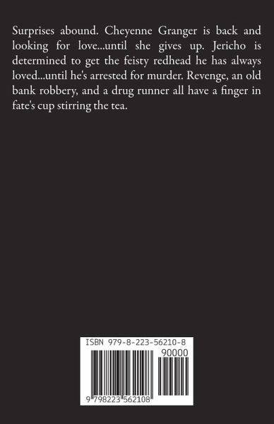 Surprises abound. Cheyenne Granger is back and looking for love...until she gives up. Jericho is determined to get the feisty redhead he has always loved...until he's arrested for murder. Revenge, an old bank robbery, and a drug runner all have a finger in fate's cup stirring the tea.
