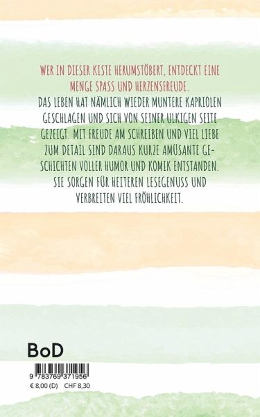 Wer in dieser Kiste herumstöbert, entdeckt eine Menge Spaß und Herzensfreude. Das Leben hat nämlich wieder muntere Kapriolen geschlagen und sich von seiner ulkigen Seite gezeigt. Mit Freude am Schreiben und viel Liebe zum Detail sind daraus kurze amüsante Geschichten voller Humor und Komik entstanden. Sie sorgen für heiteren Lesegenuss und verbreiten viel Fröhlichkeit.
