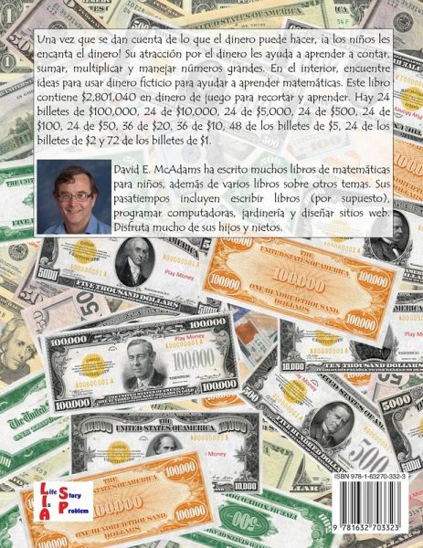 Una vez que se dan cuenta de lo que el dinero puede hacer, ¡a los niños les encanta el dinero! Su atracción por el dinero les ayuda a aprender a contar, agregar, multiplicar y manejar grandes números. En el interior, encuentre ideas para usar dinero para ayudar a aprender matemáticas. Este libro contiene $ 2,801,040 en dinero para cortar y aprender. Hay 24 de las facturas de $ 100,000, 24 de las facturas de $ 10,000, 24 de las facturas de $ 5,000, 24 de las facturas de $ 500, 24 de las facturas de $ 100, 24 de las facturas de $ 50, 36 de las facturas de $ 20, 36 de las facturas de $ 10, 48 de los billetes de $ 5, 24 de los billetes de $ 2 y 72 de las facturas de $ 1.