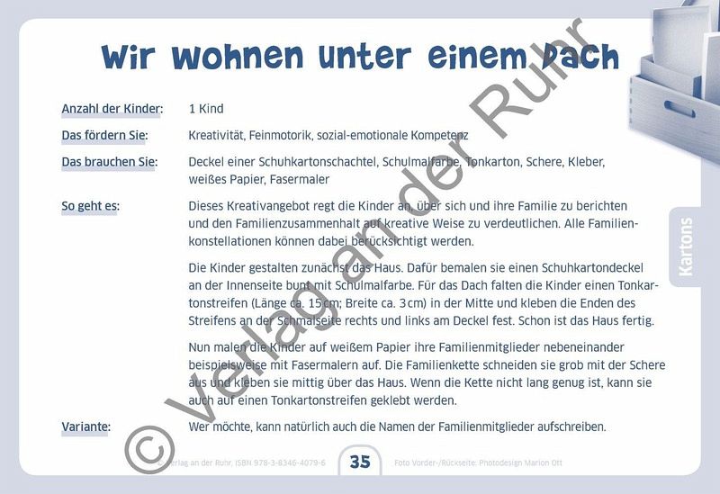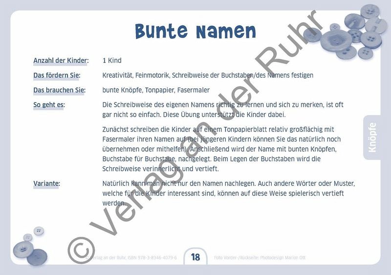 Fotokarten mit Lernspielideen zu den Bildungsbereichen für ErzieherInnen in der Kita; Altersgruppe 3-6 Jahre +++ So viel Lern- und Spielfreude versteckt sich in den Dingen, die wir im Alltag oft gar nicht wahrnehmen. Mit diesen motivierenden und selbsterklärenden Karten werden Kinder herausgefordert, Wäscheklammern, Putzschwämme und Zeitungspapier auf vielfältige Weise auszuprobieren und dabei wertvolle Erfahrungen in den unterschiedlichen Bildungsbereichen zu machen. Zu zehn überwiegend kostenlosen Alltagsmaterialien (Pappröhren, Plastikflaschen, Zeitungspapier, Plastikbecher, Trinkhalme, Knöpfe, Putzschwämme, Kartons, Bierdeckel, Wäscheklammern) finden sich zahlreiche Impulse für Kita-Kinder - allein, zu zweit oder in der Gruppe. Die Impulse sind den Bildungsbereichen zugeordnet und fördern Mathematik & Geometrie, Sprachförderung & Literacy, Ästhetik & Gestaltung, soziales Erleben sowie Gesundheit & Bewegung. Auf der Rückseite finden sich jeweils Erläuterungen für Sie. Die Karten wecken die Experimentierfreude der Kinder und fördern so spielerisch wichtige Vorläuferfertigkeiten. Daher sind sie besonders auch für Vorschulkinder geeignet.