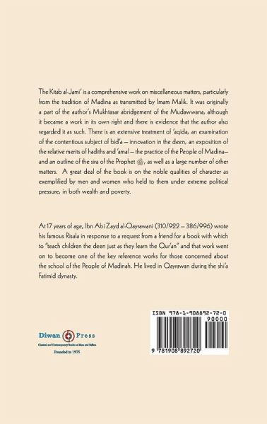Kitab al-Jami' is a comprehensive work on miscellaneous matters, particularly from the tradition of Madina as transmitted by Imam Malik. It was originally a part of the author's Mukhtasar of the Mudawwana. although it became a work in its own right and there is evidence that the author also regarded it as such. There is an extensive treatment of 'aqida, an examination of the contentious subject of bid'a - innovation in the deen, an exposition of the relative merits of hadiths and 'amal - the practice of the People of Madina- and an outline of the sira of the Prophet, peace be upon him, as well as a large number of other matters. A great deal of the book is on the noble qualities of character as exemplified by men and women who held to them under extreme political pressure, in both wealth and poverty.