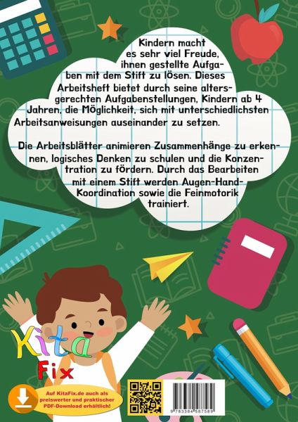 Kindern macht es sehr viel Freude, ihnen gestellte Aufgaben mit dem Stift zu lösen. Dieses Arbeitsheft bietet durch seine altersgerechten Aufgabenstellungen, Kindern ab 4 Jahren, die Möglichkeit, sich mit unterschiedlichsten Arbeitsanweisungen auseinander zu setzen.Die Arbeitsblätter animieren Zusammenhänge zu erkennen, logisches Denken zu schulen und die Konzentration zu fördern. Durch das Bearbeiten mit einem Stift werden Augen-Hand-Koordination sowie die Feinmotorik trainiert.
