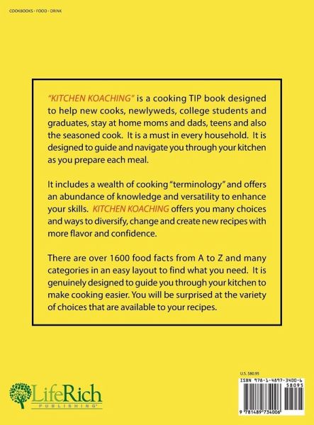 "KITCHEN KOACHING" is a cooking TIP book designed to help new cooks, newlyweds, college students and graduates, stay at home moms and dads, teens and also the seasoned cook. It is a must in every household. It is designed to guide and navigate you through your kitchen as you prepare each meal. It includes a wealth of cooking "terminology" and offers an abundance of knowledge and versatility to enhance your skills. KITCHEN KOACHING offers you many choices and ways to diversify, change and create new recipes with more flavor and confidence. There are over 1600 food facts from A to Z and many categories in an easy layout to find what you need. It is genuinely designed to guide you through your kitchen to make cooking easier. You will be surprised at the variety of choices that are available to your recipes.